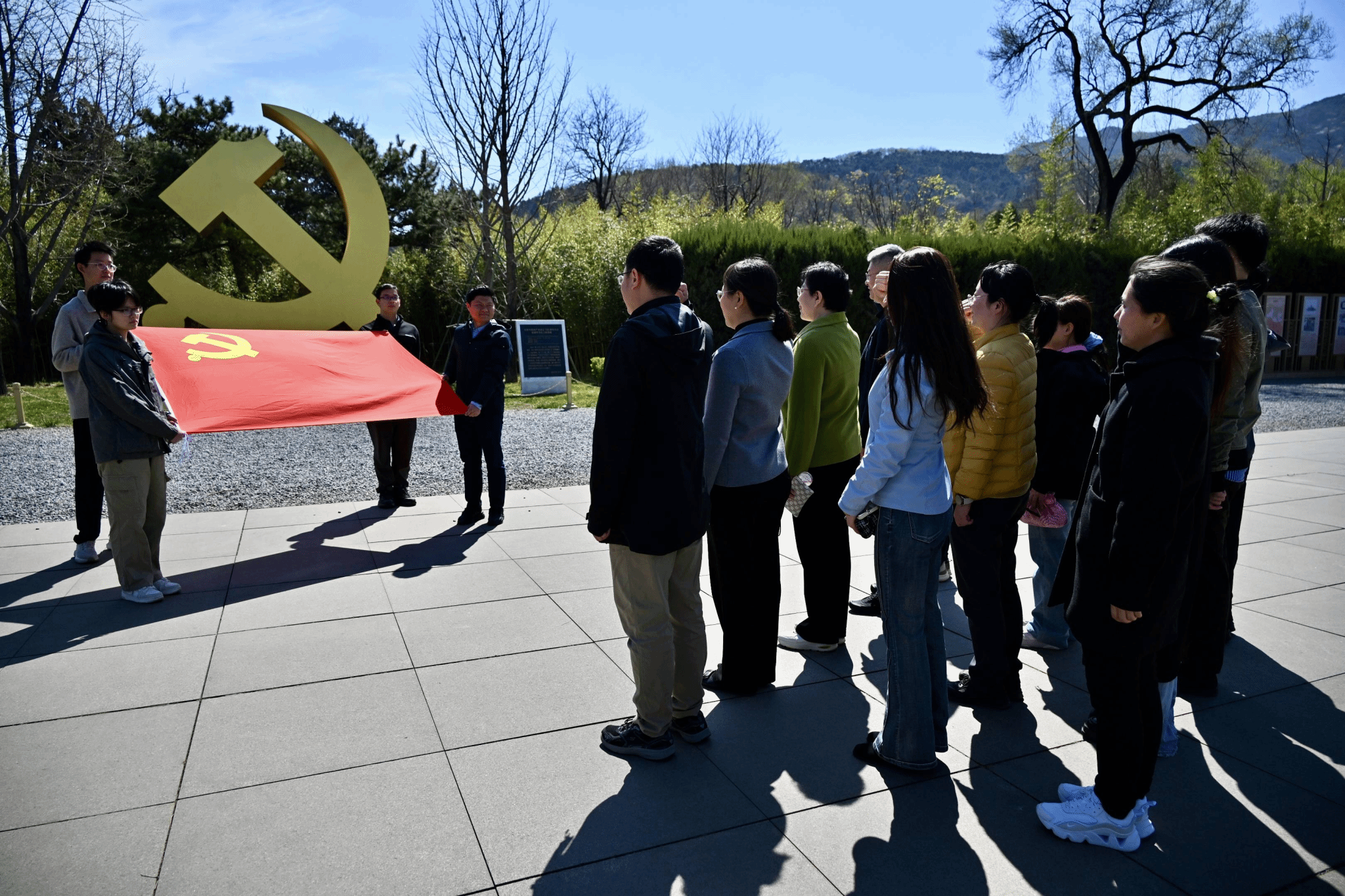 在庄严肃穆的党徽前,全体党员同志整齐列队,重温入党誓词。铿锵有力的誓言回荡在香山脚下,表达了大家为共产主义事业奋斗终身的坚定信念和对革命先辈的深切缅怀。