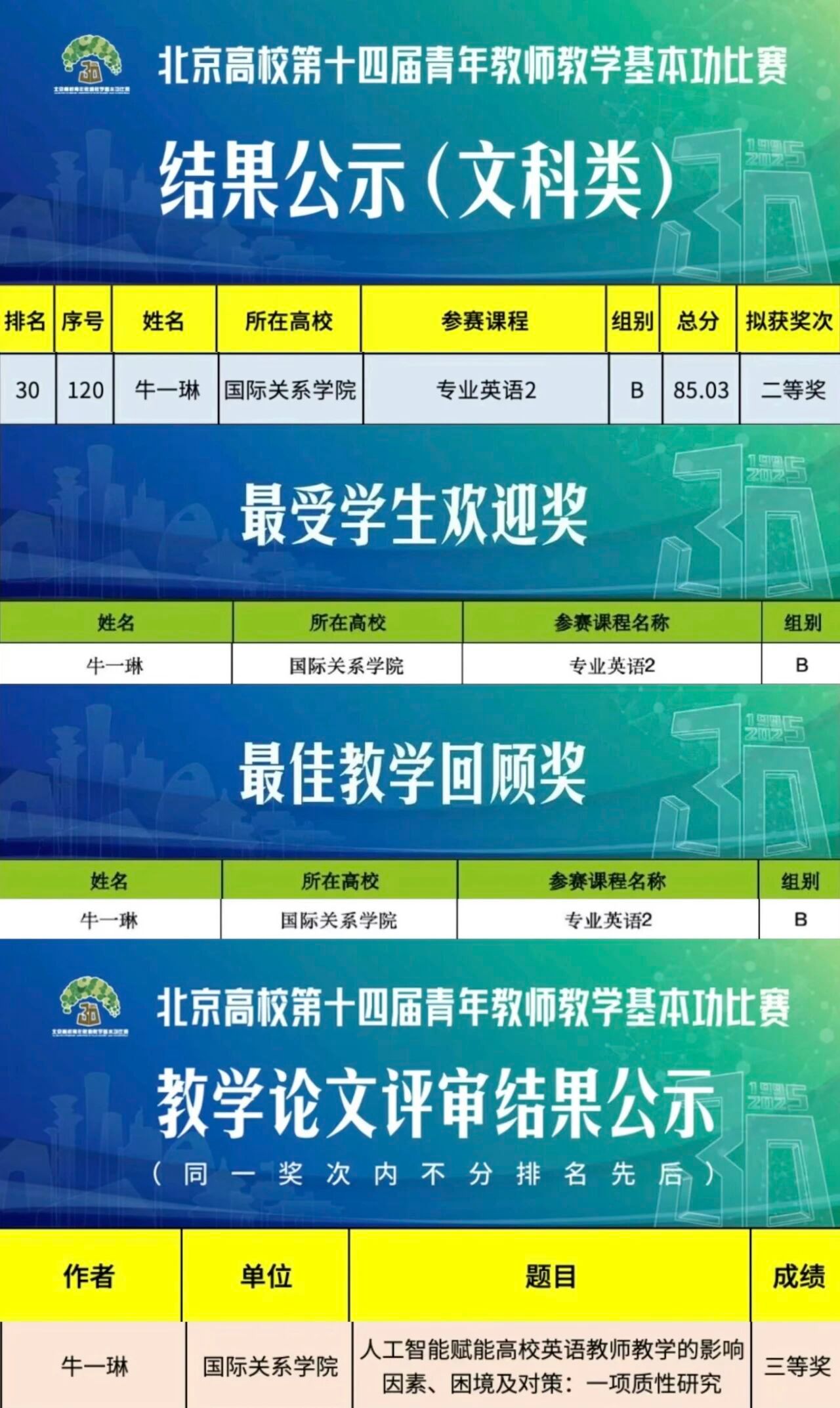 近日,在第十四届北京高校青年教师教学基本功比赛(以下简称"青教赛”)中,国际关系学院牛一琳老师凭借扎实的教学功底与精心的备赛设计,荣获文科类B组二等奖、最受学生欢迎奖、最佳教学回顾奖及教学论文三等奖。作为综合英语课程虚拟教研室骨干成员,牛老师将参赛心得凝练为“关关难过关关过”,并系统梳理了各环节经验,以期为青年教师成长提供切实参考。