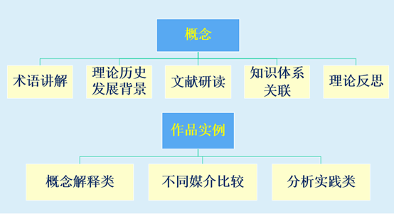 《叙事学》课程设计围绕“理论概念讲解”与“作品实例”两大主线展开。概念部分涵盖术语辨析、理论源流、文献研读、跨学科关联与理论反思五个层面,旨在帮助学生构建系统而开放的知识图谱。作品实例则分为三类:用于阐释概念的典型范例、用于比较叙述策略在不同媒介中的体现的对照案例、以及用于深化理解的作品分析实践。三类实例由浅入深,与理论讲解环环相扣,引导学生从认知到辨识,从理解到应用。