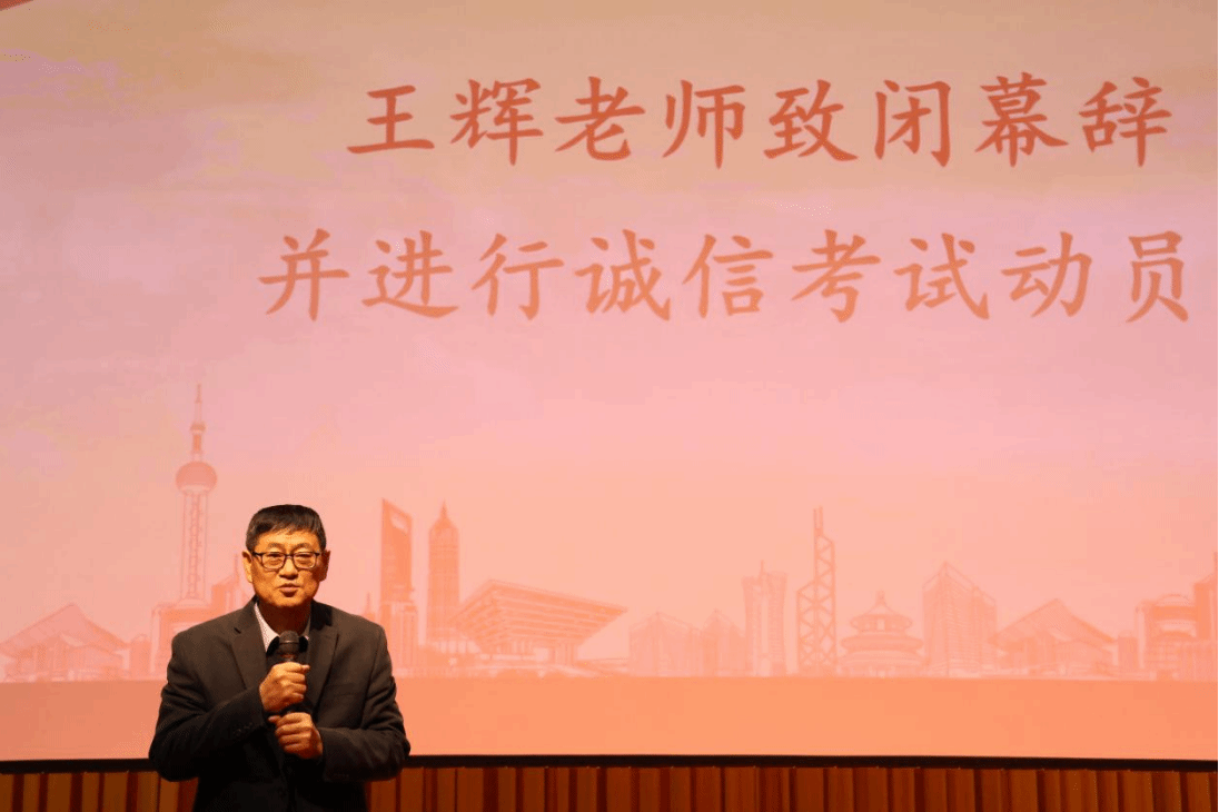 王辉老师为本次大会做闭幕致辞并进行诚信考试动员。他分享了公共管理系在本学期取得的优秀成绩,对同学们的共同努力和相互支持表示肯定和鼓励,并希望公管学子继续向优秀的师哥师姐学习,发扬公管人奋发向上、永不言弃的作风。最后,王辉老师表达了对同学们要以德为先、德才兼备的期望,以及要严格遵守规章制度、坚决履行诚信规范的嘱托,并预祝同学们期末考试顺利。